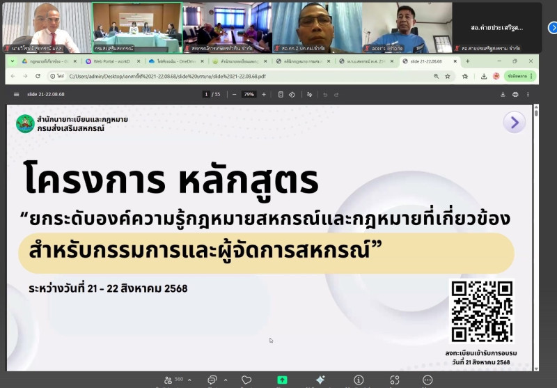 วันพฤหัสบดีที่ 21 สิงหาคม 2568 นายนรินทร์ศักดิ์ พนิตธรรมกูล สหกรณ์จังหวัดเชียงราย มอบหมายให้บุคลากรสำนักงานสหกรณ์จังหวัดเชียงราย เข้าร่วมรับฟังการอบรมโครงการฝึกอบรม หลักสูตร “ยกระดับองค์ความรู้กฎหมายสหกรณ์และกฎหมายที่เกี่ยวข้อง สำหรับกรรมการและผู้จัดการสหกรณ์” ผ่านระบบออนไลน์ Zoom Meetings ภายใต้โครงการยกระดับองค์ความรู้ด้านกฎหมายสหกรณ์ และเพิ่มศักยภาพด้านการกำกับ ตรวจสอบ เพื่อคุ้มครองระบบสหกรณ์ โดยมีวัตถุประสงค์เพื่อให้กรรมการและผู้จัดการสหกรณ์ในภาคการเกษตรและนอกภาคการเกษตรมีความรู้ความเข้าใจเกี่ยวกับบทบาทหน้าที่ความรับผิดชอบของตนเอง และสามารถบริหารจัดการธุรกิจของสหกรณ์ควบคู่หลักธรรมาภิบาลได้อย่างมีประสิทธิภาพ กลุ่มเป้าหมายประกอบด้วย กรรมการและผู้จัดการสหกรณ์ในภาคการเกษตรและนอกภาคการเกษตร ทั้งนี้ โครงการฝึกอบรมดังกล่าวกำหนดจัดอบรมระหว่างวันที่ 21-22 สิงหาคม 2568 โดยมีกรรมการดำเนินการและผู้จัดการสหกรณ์ในจังหวัดเชียงราย เข้ารับการอบรมดังกล่าว จำนวน 8 สหกรณ์
