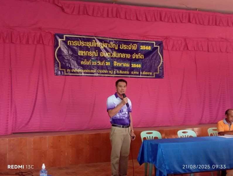 วันพฤหัสบดีที่ 21 สิงหาคม 2568 นายนรินทร์ศักดิ์ พนิตธรรมกูล สหกรณ์จังหวัดเชียงราย มอบหมายให้ กลุ่มส่งเสริมสหกรณ์ 4 โดยนางปุญชรัสมิ์ จำรัส นักวิชาการสหกรณ์ชำนาญการ พร้อมด้วย นายอุเทน ทาปัญญา นักวิชาการสหกรณ์ เข้าร่วมประชุมใหญ่สามัญประจำปี สหกรณ์ อ.บ.ต. สันกลาง จำกัด ได้ให้คำแนะนำที่ประชุมใหญ่เกี่ยวกับบทบาทหน้าที่ของสมาชิกสหกรณ์ การเข้าร่วมประชุมใหญ่ เกณฑ์การประเมินความเข้มแข็ง 4 มิติ เพื่อนำมาใช้ในการจัดชั้นความเข้มแข็งของสหกรณ์ และรับทราบผลการดำเนินงานประจำปีของสหกรณ์ การพิจารณาอนุมัติงบแสดงฐานะการเงินสิ้นสุดประจำปี 2568 อนุมัติการจัดสรรกำไรสุทธิประจำปี พิจารณาอนุมัติแผนการดำเนินงานและงบประมารายรับ - รายจ่ายประจำปี 2569 การกำหนดวงเงินกู้ยืมหรือการค้ำประกันประจำปี การแก้ไขเพิ่มเติมข้อบังคับสหกรณ์ ให้เป็นไปตามกฎกระทรวง และการมีส่วนร่วมในการดำเนินธุรกิจกับกลุ่มด้วยความระมัดระวังให้อยู่ภายใต้กรอบของกฎหมาย ข้อบังคับของกลุ่มโดยอาศัยมติของที่ประชุมของคณะกรรมการเป็นเครื่องมือในการขับเคลื่อนการดำเนินงานตามแผนงานประจำปีทีได้รับอนุมัติจากที่ประชุมใหญ่สามัญประจำปี เพื่อประโยชน์และเป็นที่พึ่งของมวลสมาชิกได้อย่างมั่นคง และยั่งยืนสืบไป