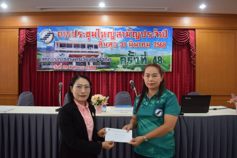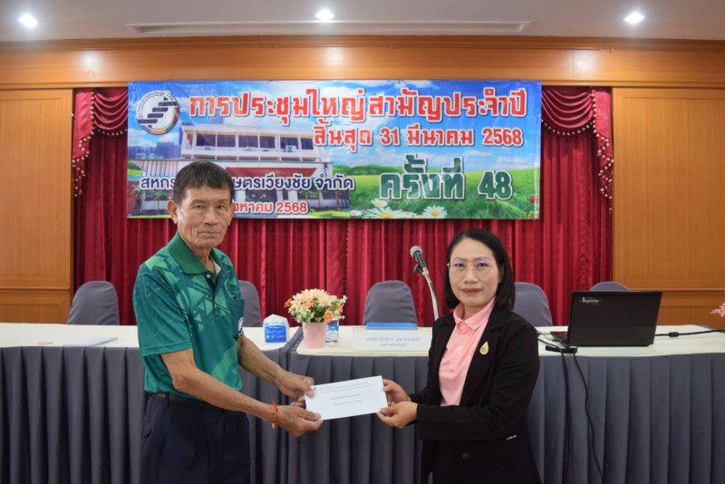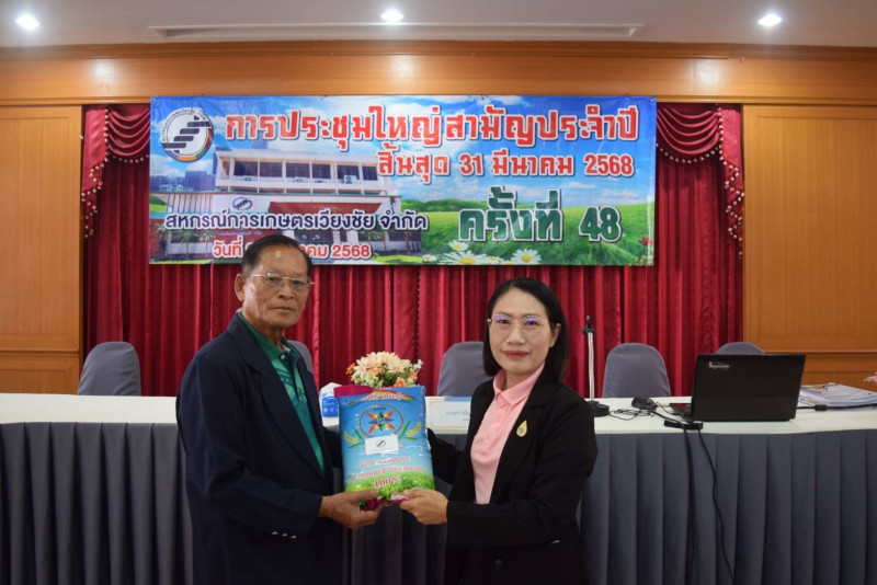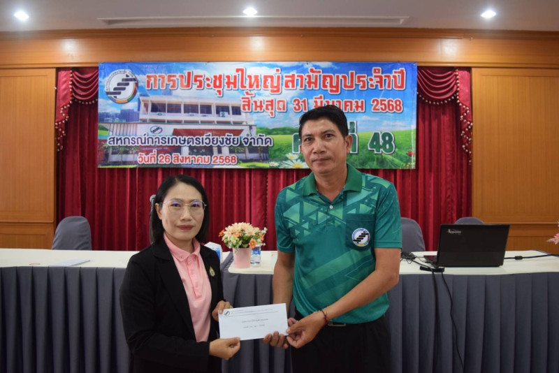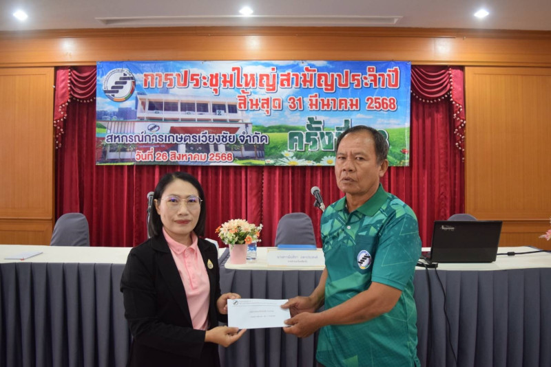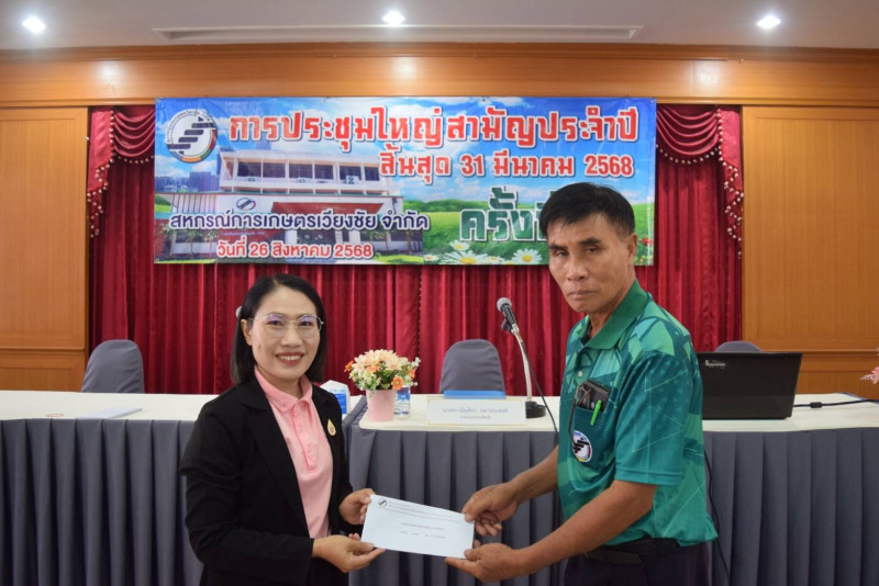 วันอังคารที่ 26 สิงหาคม 2568 เวลา 09.00 น. นายนรินทร์ศักดิ์ พนิตธรรมกูล สหกรณ์จังหวัดเชียงราย ได้มอบหมายให้นางสาวนงนุช พุทธเคน ผู้อำนวยการกลุ่มส่งเสริมสหกรณ์ 6 พร้อมด้วยนายพิพัฒน์ วงค์ริน นักวิชาการสหกรณ์ชำนาญการ และนายราชิต พุทธกนิษฐกุล นักวิชาการสหกรณ์ชำนาญการ เข้าร่วมประชุมใหญ่สามัญประจำปี ครั้งที่ 48 สหกรณ์การเกษตรเวียงชัย จำกัด สำหรับปีบัญชีสิ้นสุด 31 มีนาคม 2568 ณ ห้องประชุมสำนักงานฯ สาขาเวียงเชียงรุ้ง อำเภอเวียงเชียงรุ้ง จังหวัดเชียงราย โดยสหกรณ์มีสมาชิกทั้งสิ้น 5,600 คน มีทุนดำเนินงาน 780,312,826.75 บาท ผลการดำเนินงานประจำปีมีกำไรสุทธิ 11,227,029.70 บาท ได้ให้คำแนะนำเรื่องความสำคัญในการเข้าร่วมประชุมใหญ่ อำนาจหน้าที่ของสมาชิกและคณะกรรมการดำเนินการ ผู้ตรวจสอบกิจการ การดำเนินการแก้ไขเพิ่มเติมข้อบังคับตามกฏกระทรวง พร้อมทั้งแนะนำให้สหกรณ์ปฏิบัติเป็นไปตามระเบียบข้อบังคับและกฎหมายอื่นที่เกี่ยวข้องอย่างเคร่งครัด ทั้งนี้สหกรณ์ได้จัดให้มีการมอบรางวัลแด่สมาชิกที่มีส่วนร่วมดีเด่น