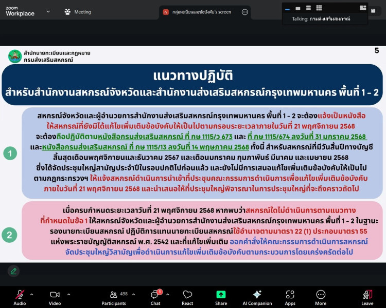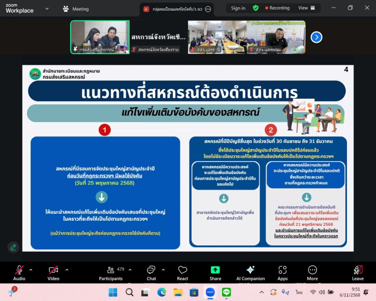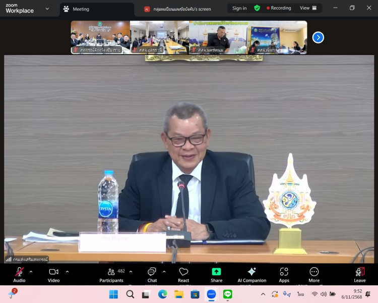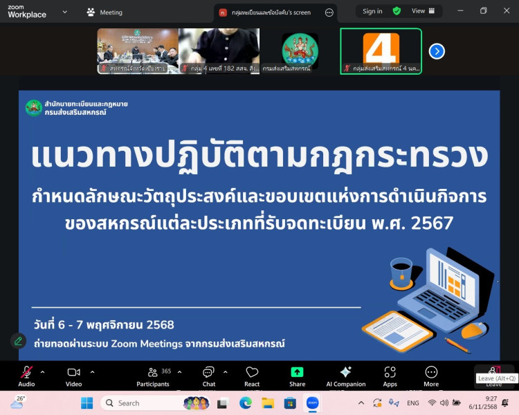 วันที่ 6 พฤศจิกายน 2568 นายนรินทร์ศักดิ์ พนิตธรรมกูล สหกรณ์จังหวัดเชียงราย พร้อมด้วยเจ้าหน้าที่กลุ่มจัดตั้งและส่งเสริมสหกรณ์ กลุ่มตรวจการสหกรณ์ และกลุ่มส่งเสริมสหกรณ์ สำนักงานสหกรณ์จังหวัดเชียงราย เข้าร่วมประชุมชี้แจงแนวทางการปฏิบัติตามกฎกระทรวงกำหนดลักษณะ วัตถุประสงค์ และขอบเขตแห่งการดำเนินกิจการของสหกรณ์แต่ละประเภทที่จะรับจดทะเบียน พ.ศ. 2567 ผ่านระบบออนไลน์ Zoom Meeting โดยมีนายประวัติ แดงบรรจง รองอธิบดีกรมส่งเสริมสหกรณ์ เป็นประธานการประชุมฯ ซึ่งมีวัตถุประสงค์เพื่อซักซ้อมและชี้แจงแนวทางปฏิบัติให้แก่บุคลากรกรมส่งเสริมสหกรณ์ให้เกิดความเข้าใจในการรับจดทะเบียนข้อบังคับให้เป็นไปในทิศทางเดียวกัน ต่อไป