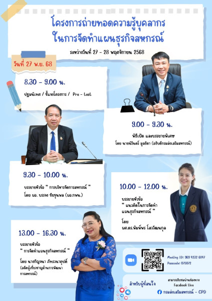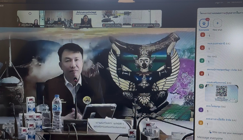 วันที่ 27 พฤศจิกายน 2568 นายนรินทร์ศักดิ์ พนิตธรรมกูล สหกรณ์จังหวัดเชียงราย มอบหมายให้กลุ่มกลุ่มส่งเสริมและพัฒนาการบริหารการจัดการสหกรณ์ เจ้าหน้าที่กลุ่มส่งเสริมสหกรณ์ และเจ้าหน้าที่สหกรณ์ 3 สหกรณ์ ได้แก่ 1) สหกรณ์การเกษตรป่าแดด จำกัด 2) สหกรณ์การเกษตรหงาวตับเต่า จำกัด 3) สหกรณ์การเกษตรศุภนิมิตห้วยชมภู จำกัด เข้าร่วมอบรมโครงการถ่ายทอดความรู้บุคลากรในการจัดทำแผนธุรกิจสหกรณ์ (กองทุนพัฒนาสหกรณ์) ผ่าระบบออนไลน์ Zoom Meeting โดยมีนายนิรันดร์ มูลธิดา อธิบดีกรมส่งเสริมสหกรณ์ เป็นประธานเปิดโครงการฯ มีจุดประสงค์เพื่อให้เจ้าหน้าที่ส่งเสริมสหกรณ์และเจ้าหน้าที่สหกรณ์ฯ มีความรู้ความเข้าใจถึงขั้นตอนและแนวทางในการจัดทำแผนธุรกิจของสหกรณ์สามารถนำองค์ความรู้ไปใช้เป็นแนวทางในการแนะนำส่งเสริมให้สหกรณ์สามารถจัดทำแผนธุรกิจได้อย่างมีประสิทธิภาพ ซึ่งจัดอบรมโครงการฯ ระหว่างวันที่ 27 - 28 พฤศจิกายน 2568