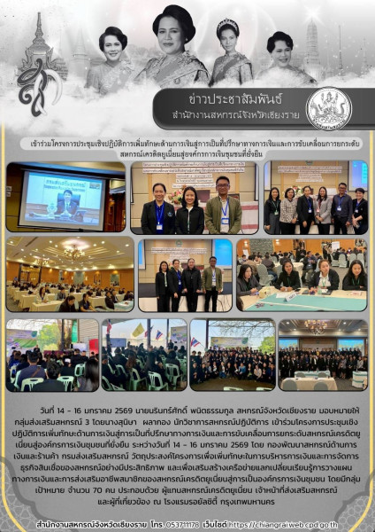 วันที่ 14 - 16 มกราคม 2569 นายนรินทร์ศักดิ์ พนิตธรรมกูล สหกรณ์จังหวัดเชียงราย มอบหมายให้กลุ่มส่งเสริมสหกรณ์ 3 โดยนางสุนิษา ผลากอง นักวิชาการสหกรณ์ปฏิบัติการ เข้าร่วมโครงการประชุมเชิงปฏิบัติการเพิ่มทักษะด้านการเงินสู่การเป็นที่ปรึกษาทางการเงินและการขับเคลื่อนการยกระดับสหกรณ์เครดิตยูเนี่ยนสู่องค์กรการเงินชุมชนที่ยั่งยืน ระหว่างวันที่ 14 - 16 มกราคม 2569 โดยกองพัฒนาสหกรณ์ด้านการเงินและร้านค้า กรมส่งเสริมสหกรณ์ วัตถุประสงค์โครงการเพื่อเพิ่มทักษะในการบริหารการเงินและการจัดการธุรกิจสินเชื่อของสหกรณ์อย่างมีประสิทธิภาพ และเพื่อเสริมสร้างเครือข่ายแลกเปลี่ยนเรียนรู้การวางแผนทางการเงินและการส่งเสริมอาชีพสมาชิกของสหกรณ์เครดิตยูเนี่ยนสู่การเป็นองค์กรการเงินชุมชน โดยมีกลุ่มเป้าหมาย จำนวน 70 คน ประกอบด้วยผู้แทนสหกรณ์เครดิตยูเนี่ยน เจ้าหน้าที่ส่งเสริมสหกรณ์ และผู้ที่เกี่ยวข้อง ณ โรงแรมรอยัลซิตี้ กรุงเทพมหานคร