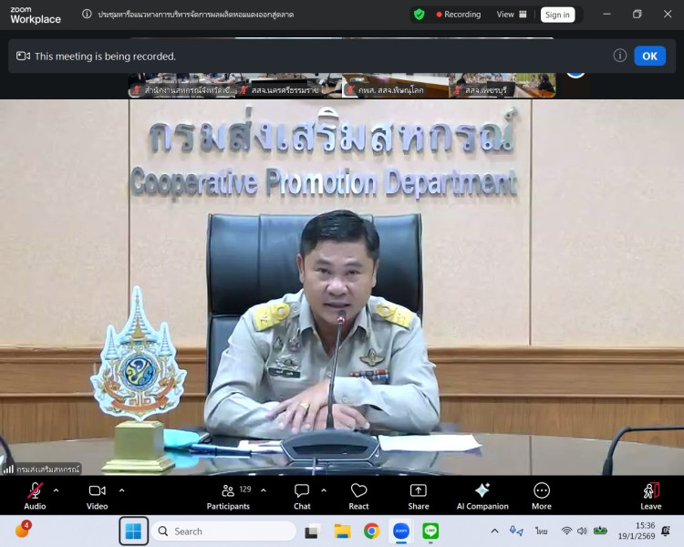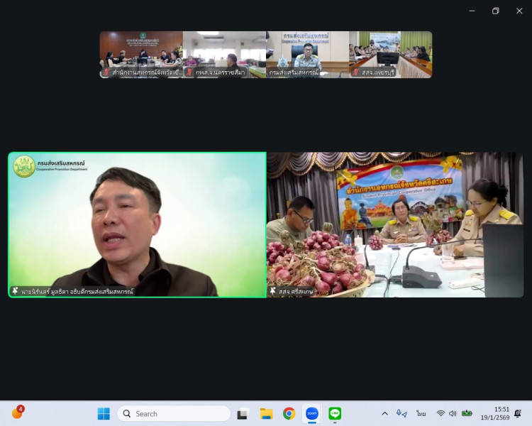 วันที่ 19 มกราคม 2569 นายนรินทร์ศักดิ์ พนิตธรรมกูล สหกรณ์จังหวัดเชียงราย พร้อมด้วยเจ้าหน้าที่กลุ่มส่งเสริมและพัฒนาธุรกิจสหกรณ์ เข้าร่วมประชุมหารือแนวทางการบริหารจัดการผลผลิตหอมแดงจังหวัดศรีสะเกษออกสู่ตลาด ผ่านระบบออนไลน์ Zoom Meeting โดยมีนายนิรันดร์ มูลธิดา อธิบดีกรมส่งเสริมสหกรณ์ เป็นประธานเปิดการประชุมฯ และมีนายณฤทธิ์ บุญชัย รองอธิบดีกรมส่งเสริมสหกรณ์ นายคีตวุฒิ นับแสง ผู้ตรวจราชการส่วนกลางและเขตตรวจราชการที่ 16 และเจ้าหน้าที่กรมส่งเสริมสหกรณ์เข้าร่วม เพื่อเป็นการเตรียมความพร้อมในการกระจายผลผลิตออกนอกพื้นที่จังหวัดศรีสะเกษ และสามารถจำหน่ายหอมแดงได้ในราคาที่เหมาะสม สามารถแก้ไขปัญหาราคาผลผลิตตกต่ำและล้นตลาดได้
