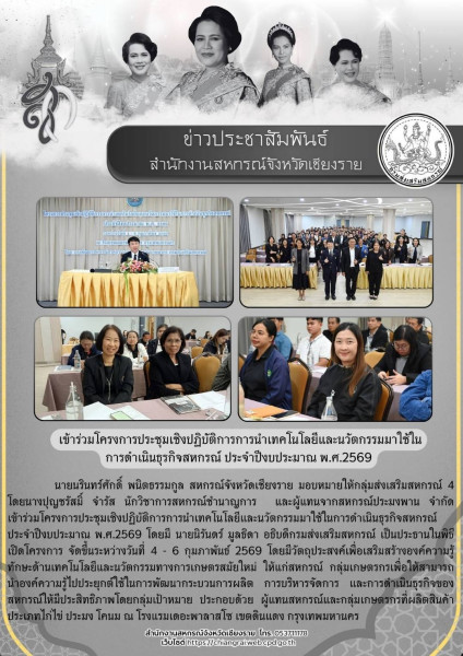 นายนรินทร์ศักดิ์ พนิตธรรมกูล สหกรณ์จังหวัดเชียงราย มอบหมายให้กลุ่มส่งเสริมสหกรณ์ 4 โดยนางปุญชรัสมิ์ จำรัส นักวิชาการสหกรณ์ชำนาญการ และผู้แทนจากสหกรณ์ประมงพาน จำกัด เข้าร่วมโครงการประชุมเชิงปฏิบัติการการนำเทคโนโลยีและนวัตกรรมมาใช้ในการดำเนินธุรกิจสหกรณ์ ประจำปีงบประมาณ พ.ศ. 2569 โดยมี นายนิรันดร์ มูลธิดา อธิบดีกรมส่งเสริมสหกรณ์ เป็นประธานในพิธีเปิดโครงการฯ ซึ่งจัดขึ้นระหว่างวันที่ 4 - 6 กุมภาพันธ์ 2569 โดยมีวัตถุประสงค์เพื่อเสริมสร้างองค์ความรู้ ทักษะด้านเทคโนโลยีและนวัตกรรมทางการเกษตรสมัยใหม่ ให้แก่สหกรณ์ กลุ่มเกษตรกรเพื่อให้สามารถนำองค์ความรู้ไปประยุกต์ใช้ในการพัฒนากระบวนการผลิต การบริหารจัดการ และการดำเนินธุรกิจของสหกรณ์ให้มีประสิทธิภาพโดยกลุ่มเป้าหมาย ประกอบด้วย ผู้แทนสหกรณ์และกลุ่มเกษตรกรที่ผลิตสินค้าประเภทไก่ไข่ ประมง โคนม ณ โรงแรมเดอะพาลาสโซ เขตดินแดง กรุงเทพมหานคร