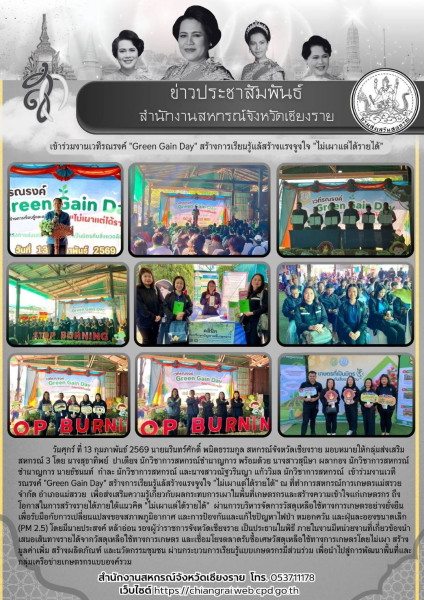 วันศุกร์ที่ 13 กุมภาพันธ์ 2569 นายนรินทร์ศักดิ์ พนิตธรรมกูล สหกรณ์จังหวัดเชียงราย มอบหมายให้กลุ่มส่งเสริมสหกรณ์ 3 โดย นางสุธาทิพย์ ปาเตียง นักวิชาการสหกรณ์ชำนาญการ พร้อมด้วยนางสาวสุนิษา ผลากอง นักวิชาการสหกรณ์ชำนาญการ นายธัชนนท์ ก๋าละ นักวิชาการสหกรณ์ และนางสาวณัฐวรินญา แก้ววิมล นักวิชาการสหกรณ์ เข้าร่วมงานเวทีรณรงค์ "Green Gain Day" สร้างการเรียนรู้แล้สร้างแรงจูงใจ "ไม่เผาแต่ได้รายได้" ณ ที่ทำการสหกรณ์การเกษตรแม่สรวย จำกัด อำเภอแม่สรวย เพื่อส่งเสริมความรู้เกี่ยวกับผลกระทบการเผาในพื้นที่เกษตรกรและสร้างความเข้าใจแก่เกษตรกร ถึงโอกาสในการสร้างรายได้ภายใต้แนวคิด "ไม่เผาแต่ได้รายได้" ผ่านการบริหารจัดการวัสดุเหลือใช้ทางการเกษตรอย่างยั่งยืน เพื่อรับมือกับการเปลี่ยนแปลงของสภาพภูมิอากาศ และการป้องกันและแก้ไขปัญหาไฟป่า หมอกควัน และฝุ่นละอองขนาดเล็ก (PM 2.5) โดยมีนายประสงค์ หล้าอ่อน รองผู้ว่าราชการจังหวัดเชียงราย เป็นประธานในพิธีเปิดงานฯ ภายในงานมีหน่วยงานที่เกี่ยวข้องนำเสนอเส้นทางรายได้จากวัสดุเหลือใช้ทางการเกษตร และเชื่อมโยงตลาดรับซื้อเศษวัสดุเหลือใช้ทางการเกษตรโดยไม่เผา สร้างมูลค่าเพิ่ม สร้างผลิตภัณฑ์ และนวัตกรรมชุมชน ผ่านกระบวนการเรียนรู้แบบเกษตรกรมีส่วนร่วม เพื่อนำไปสู่การพัฒนาพื้นที่และกลุ่มเครือข่ายเกษตรกรแบบองค์รวม