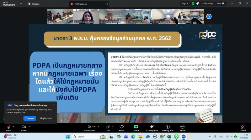 วันที่ 4 มีนาคม 2569 นายนรินทร์ศักดิ์ พนิตธรรมกูล สหกรณ์จังหวัดเชียงราย มอบหมายให้กลุ่มจัดตั้งและส่งเสริมสหกรณ์ และกลุ่มส่งเสริมสหกรณ์ 1-6 เข้าอบรมความรู้เบื้องต้นเกี่ยวกับกฎหมายคุ้มครองข้อมูลส่วนบุคคลและรับฟังการชี้แจงการใช้งานระบบทะเบียนสมาชิกและทะเบียนหุ้นของสหกรณ์และกลุ่มเกษตรกร ประจำปี พ.ศ. 2569 ผ่านระบบ Zoom Meeting ซึ่งมีวัตถุประสงค์เพื่อให้เจ้าหน้าที่ผู้รับผิดชอบฯ มีความเข้าใจที่ถูกต้องในการบันทึกจัดเก็บและใช้ข้อมูลส่วนบุคคลอย่างปลอดภัย รวมถึงสามารถใช้งานระบบทะเบียนสมาชิกและทะเบียนหุ้นของสหกรณ์และกลุ่มเกษตรกรได้อย่างมีประสิทธิภาพ
