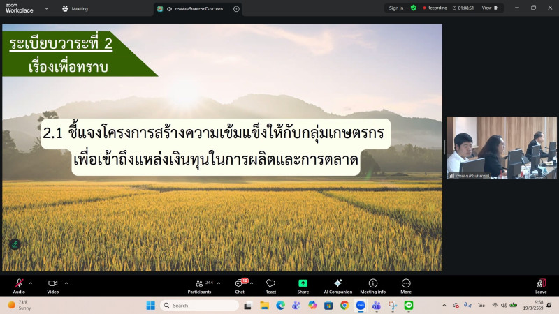 ร่วมประชุมติดตามผลการดำเนินงานโครงการสร้างความเข้มแข็งให้กับกลุ่มเกษตรกรเพื่อเข้าถึงแหล่งเงินทุนในการผลิตและการตลาด ผ่านระบบ Zoom Meeting