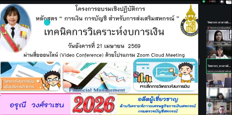 วันที่ 20 - 24 เมษายน 2569 นายนรินทร์ศักดิ์ พนิตธรรมกูล สหกรณ์จังหวัดเชียงราย มอบหมายให้นางสาวกรกนก เอี่ยมสำอางค์ นักวิชาการสหกรณ์ชำนาญการ เข้าร่วมอบรมเชิงปฏิบัติการ หลักสูตร “การเงิน การบัญชี สำหรับการส่งเสริมสหกรณ์” ผ่านระบบทางไกลออนไลน์ (Video Conference) ด้วยโปรแกรม Zoom Cloud Meeting ถ่ายทอดสัญญาณและหลักสูตรโดยคณะวิทยาการจัดการ มหาวิทยาลัยสงขลานครินทร์ ผู้เข้าอบรมรวมจำนวน 100 คน มีวัตถุประสงค์เพื่อพัฒนาบุคลากรให้สามารถนำความรู้ที่ได้ไปเป็นแนวทางปฏิบัติในการเพิ่มประสิทธิภาพการบริหารจัดการสหกรณ์ รวมถึงการคาดการณ์แนวโน้มการดำเนินธุรกิจผ่านงบการเงินได้อย่างเหมาะสม มีทักษะในการคิดวิเคราะห์และการมองภาพองค์รวมให้สอดรับกับสถานการณ์ที่เปลี่ยนไป มีความรู้ความเข้าใจในด้านการเงิน การบัญชี และการบริหารจัดการสหกรณ์ และสามารถกำกับดูแลสหกรณ์ได้อย่างมีประสิทธิภาพและมีธรรมาภิบาล